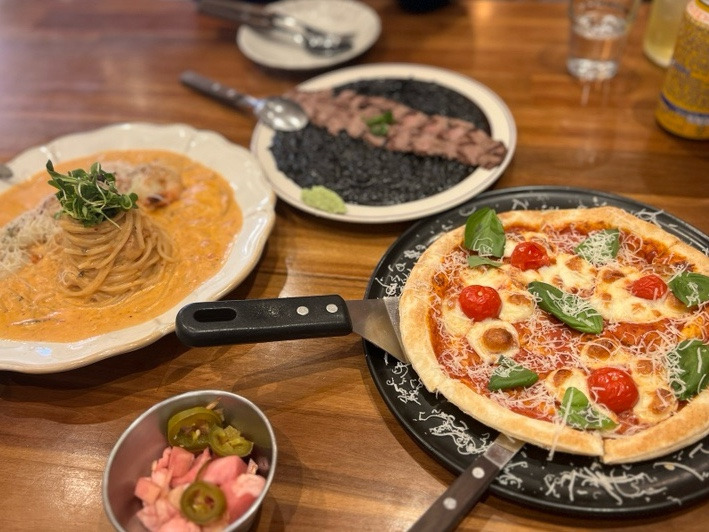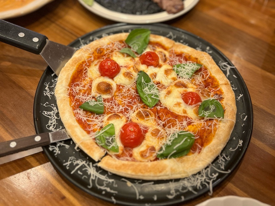 마지막으로 나온 마르게리따 피자는 화덕 느낌의 얇은 도우에 신선한 토마토소스와 바질이 올라간 클래식한 스타일이었어요. 치즈가 과하지 않고 깔끔해서 다른 메뉴와 함께 먹기에 부담 없는 맛이었어요.